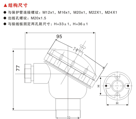 與接線板固定兩孔距尺寸: H =33±1,H=36±1